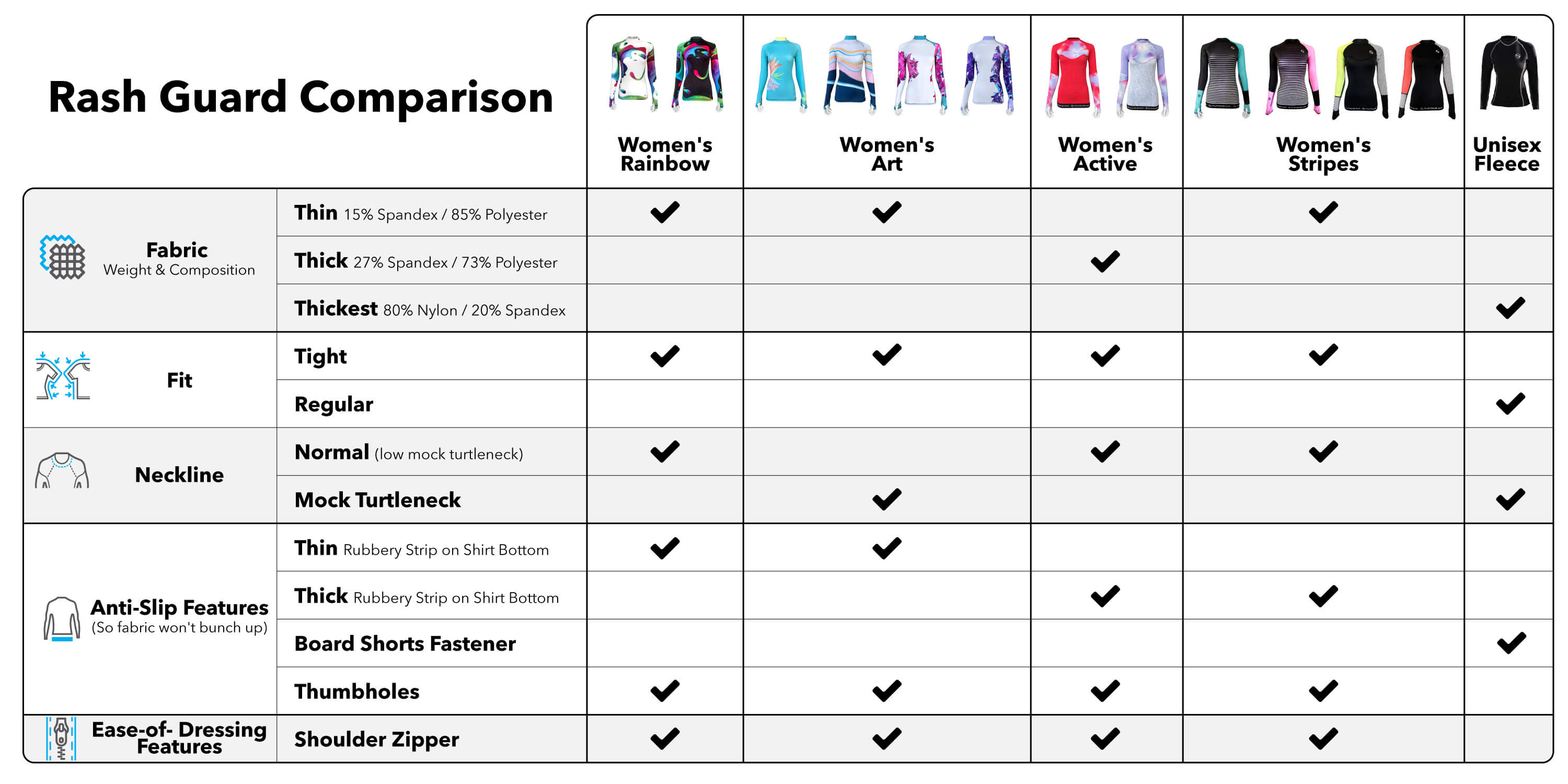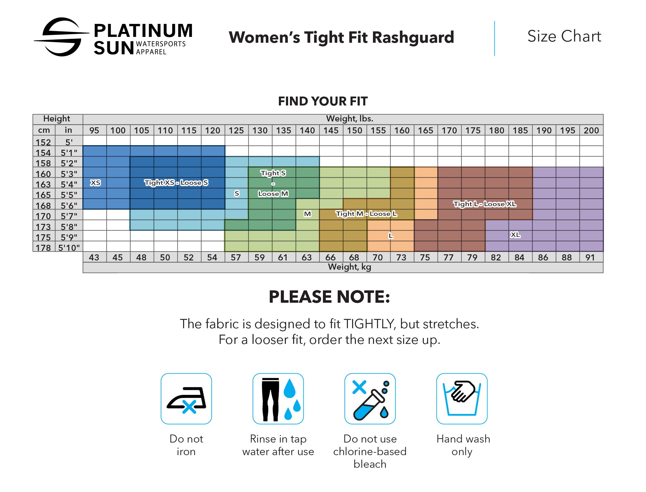 The rash guard tops have a TIGHT ERGONOMIC FIT, more of a performance fit. The rash guard is comfortable during various water activities and mentions its stretchy fabric. For watersports, RASH GUARDS ARE SUPPOSED TO FIT VERY TIGHT AND SNUG THE BODY!