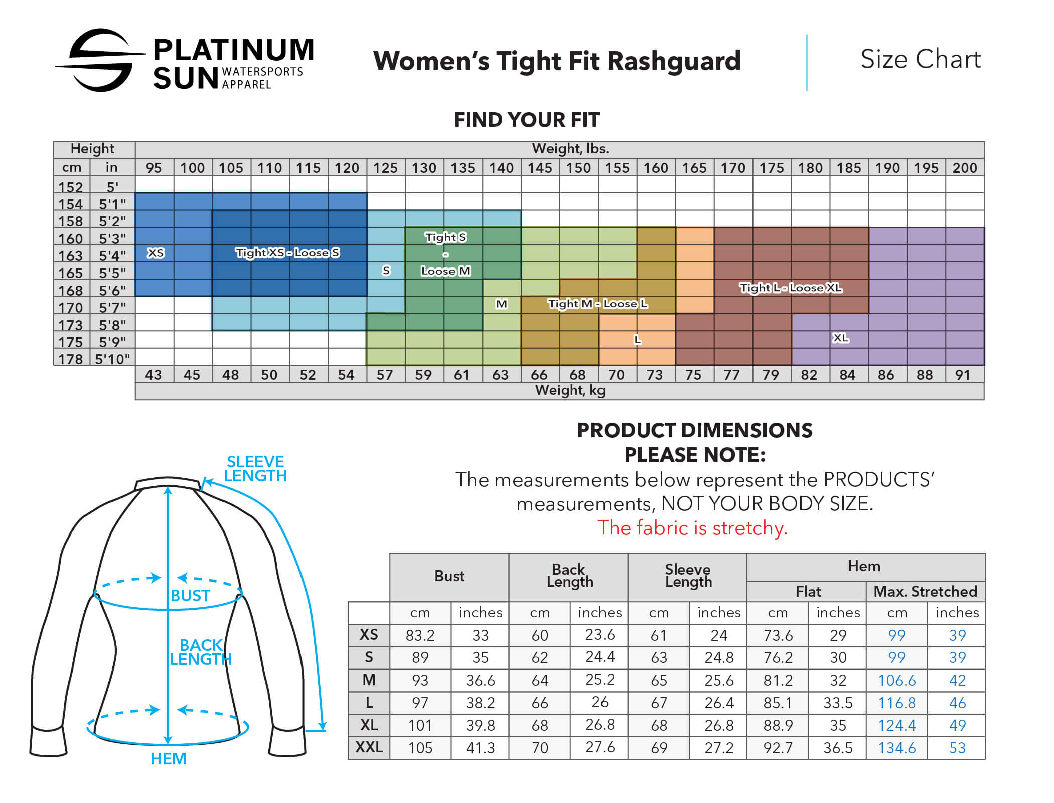 The rash guard tops have a TIGHT ERGONOMIC FIT, more of a performance fit. The rash guard is comfortable during various water activities and mentions its stretchy fabric. For watersports, RASH GUARDS ARE SUPPOSED TO FIT VERY TIGHT AND SNUG THE BODY!